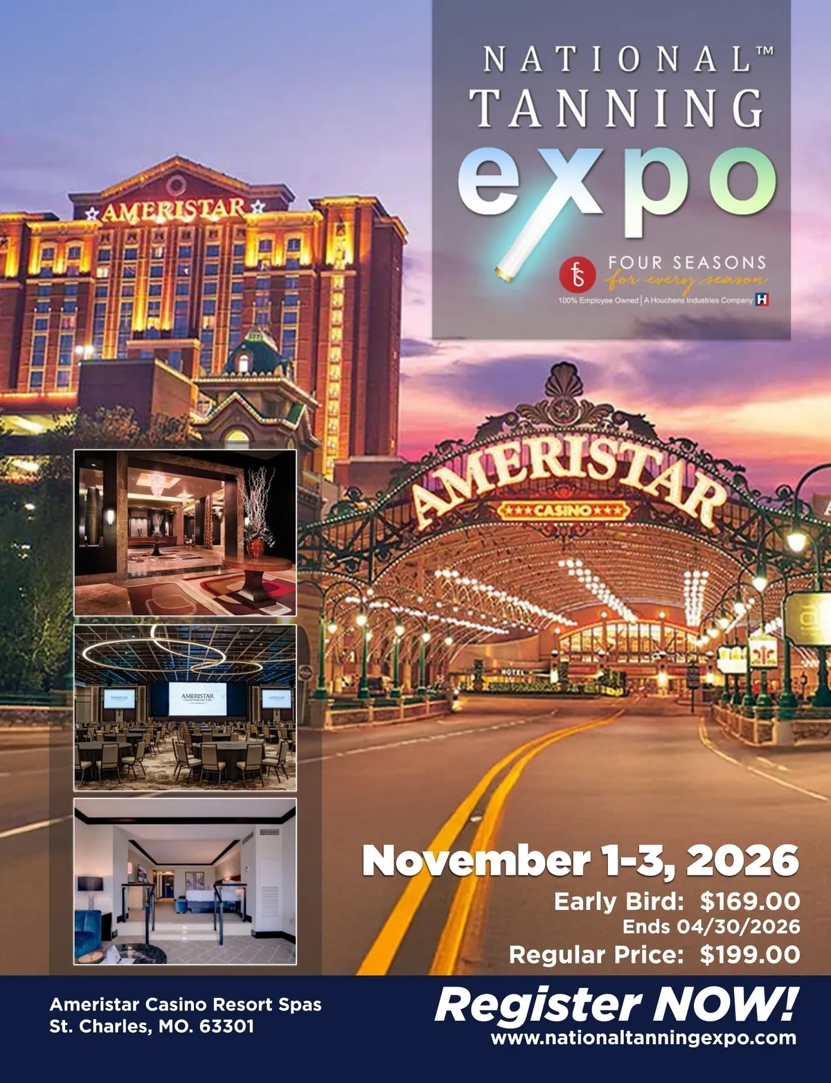 November 1-3, 2026 Ameristar Casino Resort Spas St. Charles, MO. 63301 Early Bird: $169.00 Ends 04/30/2026 Register NOW! www.nationaltanningexpo.com Regular Price: $199.00